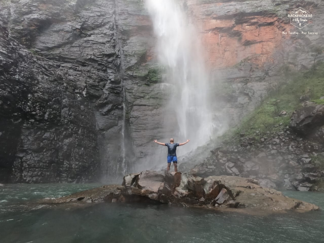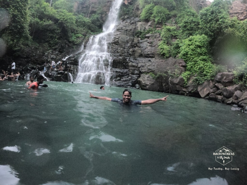 Finally we reached the waterfalls. We were surprised by the crowd at the first instance. It was heavily crowded. Since it’s monsoon the flow was good enough to enjoy taking a bath. Back of the mind corona fear was running. Only Ravi teja, Bharath and Me got into the water initially. We just tried to go underneath the waterfall and enjoyed the fall directly on us. The kinetic energy of waterfall hitting you will make you feel like kind of water massage 😛 😛. Later Nikhil too joined. Ahmed and Eknath just clicked few pics.